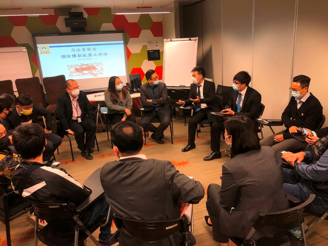 工作坊上,司警局刑侦人员介绍局方报案程序及与博彩相关的犯罪概况,并通过播放防罪宣传短片和分享真实案例,让博彩业前线工作人员更直观地瞭解多种常见罪案类型和不法份子的犯罪手法,包括网恋诈骗、电话诈骗、伪造文件、伪钞及清洗黑钱等犯罪,并向他们传授预防犯罪的对策。其后,司警局刑侦人员与他们进行分组座谈,解答他们工作和生活上遇到的治安问题,以及交流最新的防罪信息,鼓励他们将防罪信息分享给亲友,共同提升防罪意识和能力,防范受到侵害。