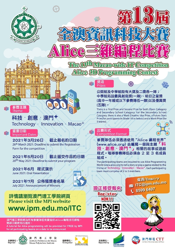 为持续推进本澳电脑编程技术的普及和信息科技的应用,以及培育更多高素质的信息科技人才,澳门理工学院自2008年起每年主办“全澳信息科技大赛–Alice三维编程比赛”,该比赛已成为澳门一项热门的三维编程比赛,深受本澳各中学学生和市民的欢迎。今年第十三届大赛由澳门理工学院主办、博彩标准协会(GSA)协办,并获得澳门教育及青年发展局和澳门邮电局的鼎力支持。是次大赛主题为“科技创意澳门+”,旨在让参赛者瞭解科技创新在现实生活中的应用,鼓励参赛者探讨科技及创意如何促进城市发展及改善生活,从澳门出发,进一步瞭解科创力量如何辐射到邻近地区,并引领该地区的协同创新及合作,为澳门智慧城市的建设和发展,培养和储备在科学、科技、工程、艺术、数学 (STEAM) 技术领域具备综合能力的科创人才。