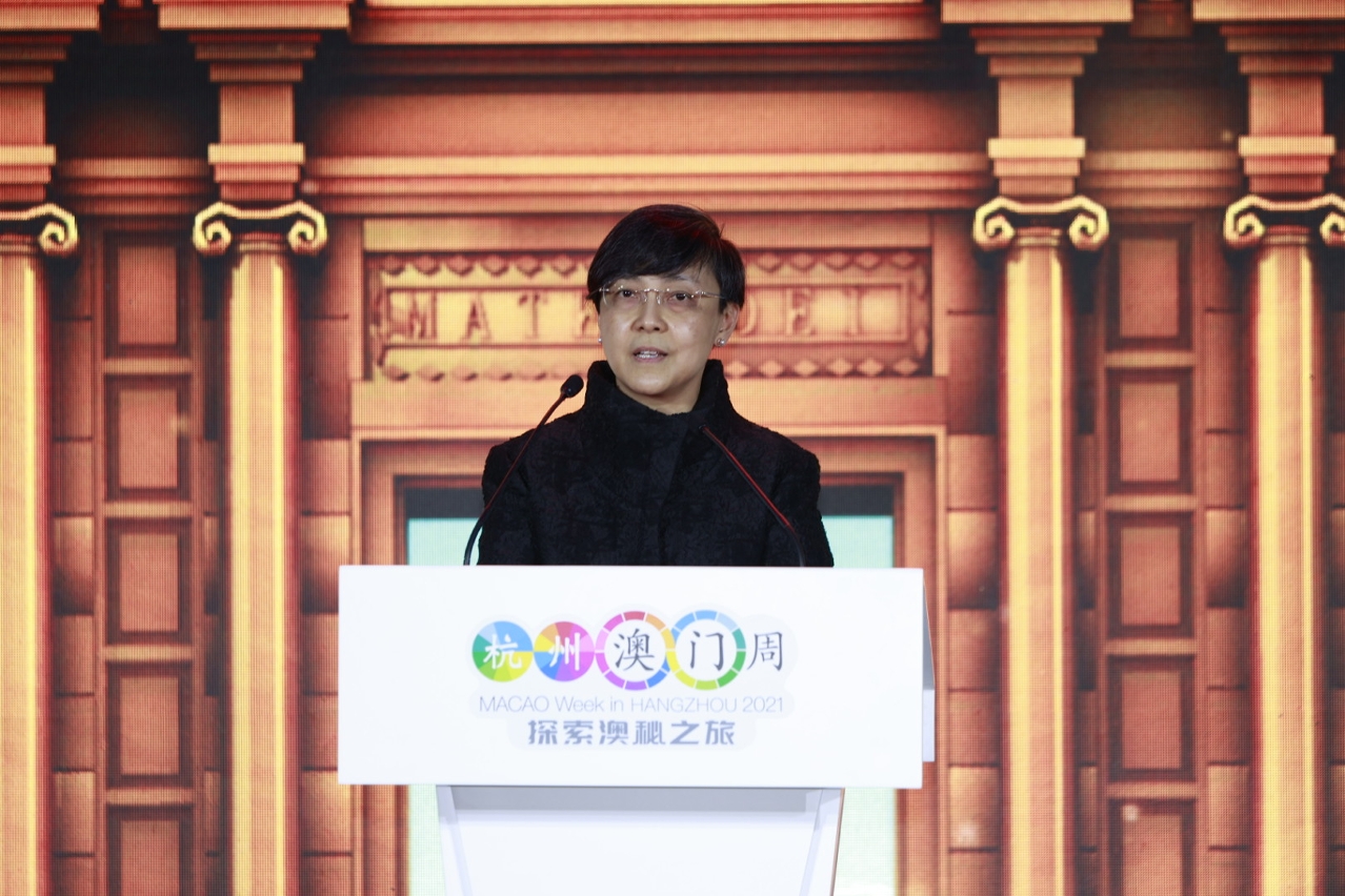 澳门特别行政区政府经济财政司司长代表、澳门特别行政区政府旅游局局长文绮华致辞时表示:“杭州与澳门有直航航班,浙江省近年位列访澳内地旅客排行十名以内,是我们重要的内地客源;从上月开始,所有内地入境澳门人士更毋须隔离,我们马上把准备好的‘澳门周’带到杭州,亲身到来传递‘澳门健康安全宜游’的信息,并展示澳门中葡文化交融的旅游魅力。”她又衷心感谢杭州方的大力支持和配合。