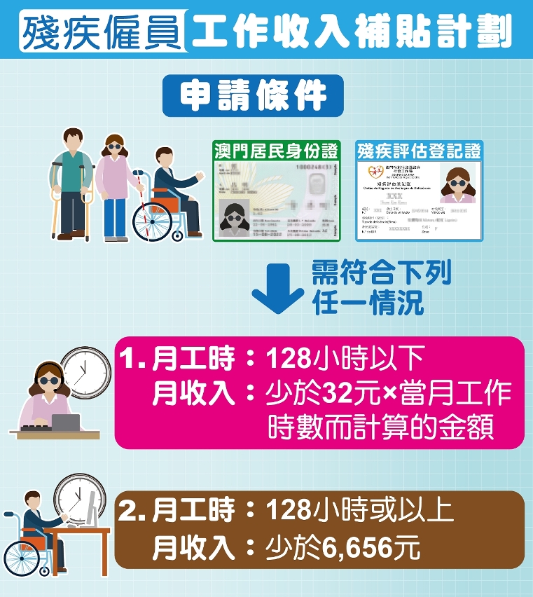 凡持有由社会工作局发出有效的残疾评估登记证的澳门居民,并符合按月累计工作总时数少于128小时,且当月工作收入少于《雇员的最低工资》规定的每小时最低工资金额32澳门元乘以当月实际提供工作时数而计算的金额;又或符合按月累计工作总时数等于或多于128小时,且当月工作收入少于《雇员的最低工资》规定的每月最低工资金额6656澳门元,均可作出申请。