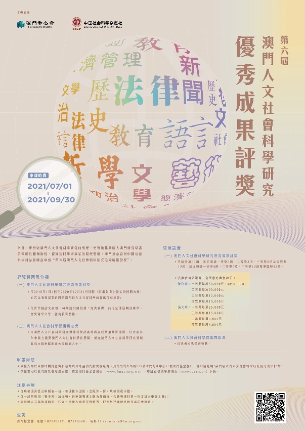 由澳门基金会和中国社会科学杂志社联合举办的“第六届澳门人文社会科学研究优秀成果评奖”的截止申报日期为2021年9月30日。