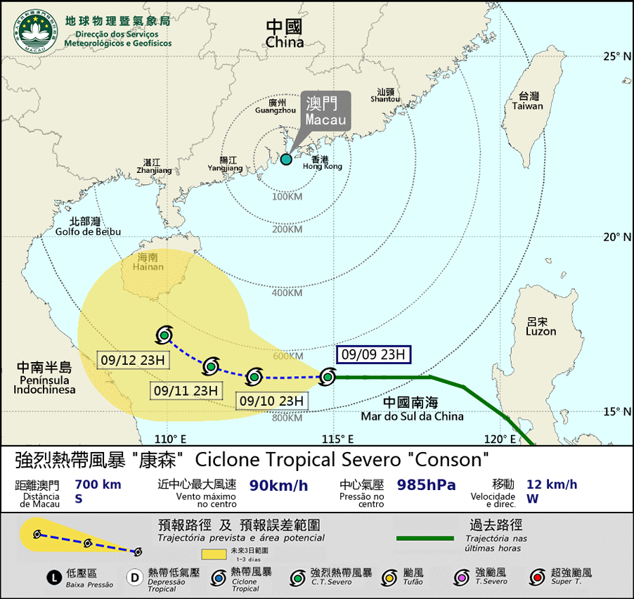强烈热带风暴「康森」未来数日将向西移动横过南海,周末大致移向海南岛附近。由于「康森」距离本澳超过600公里,除非其采取更偏北路径移动或迅速发展,否则改发更高风球机会偏低。同时位于西北太平洋的超强台风「灿都」未来数日将大致移向台湾附近。另一方面,由于近日非天文大潮且热带气旋距离本澳较远,因此出现风暴潮造成水浸的机会不大。