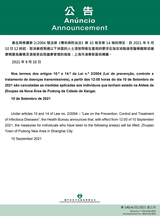 新型冠状病毒感染应变协调中心宣布,因应上海市的疫情变化,卫生局根据第2/2004号法律《传染病防治法》第10条和第14条的规定,自2021年9月10日中午12时起,取消曾经到过以下地区的人士须按照卫生当局的要求在指定地点接受医学观察或健康码变为黄码及须接受自我健康管理的措施:上海市浦东新区祝桥镇。