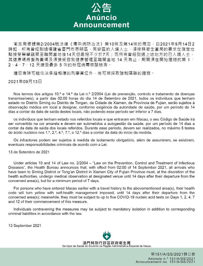新型冠状病毒感染应变协调中心宣布,因应福建省的疫情变化,卫生局根据第2/2004号法律《传染病防治法》第10条和第14条的规定,自2021年9月14日上午2时起,所有曾经到过福建省厦门市思明区或同安区的入境人士,须按照卫生当局的要求在指定地点接受医学观察至离开当地后14天但最短不少于7天;而所有曾经到过上述地方的已入境人士,其健康码将变为黄码及须接受自我健康管理至离开当地 14 天为止,期间须在开始措施的第 1、2、4、7、12 天接受最多 5 次的新冠病毒核酸检测。免费核酸检测预约连结为https://app.ssm.gov.mo/mandatoryrnatestbook。核酸检测结果不会上载至澳门健康码亦不可作为出入境用途。如需将核酸检测结果在澳门健康码显示,则须自费检测。