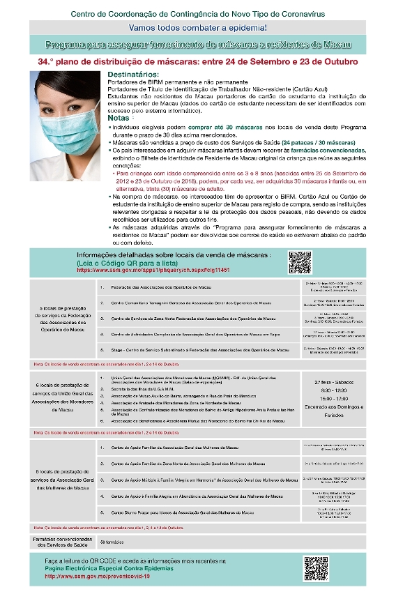 新型冠状病毒感染应变协调中心今(23)日公布,第34轮保障口罩供应澳门居民计划(下称“口罩计划”)于周五(24日)开始,售卖期间为30日,即2021年9月24日至10月23日,期间每人可一次性购买30个口罩,售价合共24澳门元。卫生局协议药房、本澳3个社团(工联、街总、妇联)继续提供售卖口罩服务,即全澳共有72个售卖点,服务时间详见附图。透过口罩计划购买的口罩,如有不合格或次货可退回卫生中心。