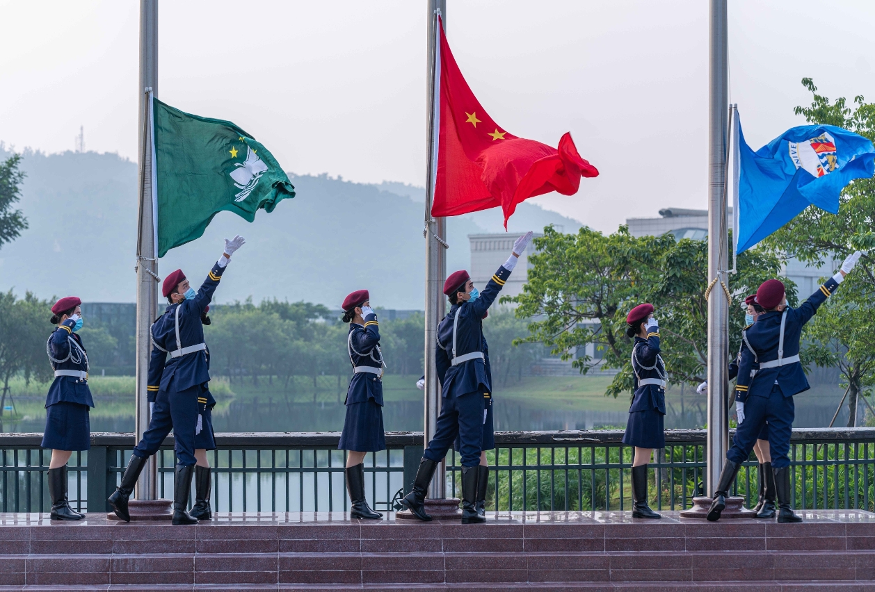 为庆祝中华人民共和国成立72周年,澳门大学国旗仪仗队今(1)日在该校莲花广场举行升旗仪式,向国家送上祝福,场面隆重。