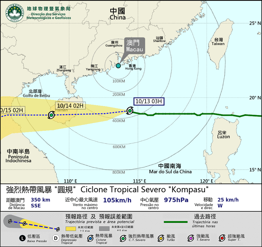 「圆规」正横过南海北部并逐渐接近澳门,预料清晨在澳门以南约350公里范围掠过,大致趋向海南岛。随着「圆规」迫近,与「圆规」相关的雨带正影响本澳,未来骤雨转趋频密,且风力会显着增强,最大风力达8至9级及有阵风,风向会由偏北风逐渐转为东至东北风,市民需留意当风位置的变化。