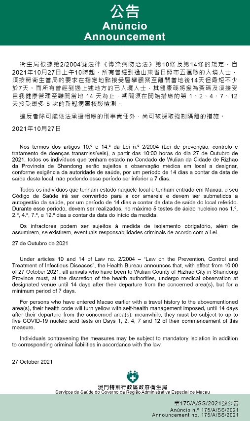 新型冠状病毒感染应变协调中心宣布,因应山东省的疫情变化,卫生局根据第2/2004号法律《传染病防治法》第10条和第14条的规定,自2021年10月27日上午10时起,所有曾经到过山东省日照市五莲县的入境人士,须按照卫生当局的要求在指定地点接受医学观察至离开当地后14天但最短不少于7天。而所有曾经到过上述地方的已入境人士,其健康码将变为黄码及须接受自我健康管理至离开当地 14 天为止,期间须在开始措施的第 1、2、4、7、12 天接受最多 5 次的新冠病毒核酸检测。免费核酸检测预约连结为https://app.ssm.gov.mo/mandatoryrnatestbook。核酸检测结果不会上载至澳门健康码亦不可作为出入境用途。如需将核酸检测结果在澳门健康码显示,则须自费检测。