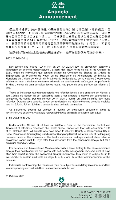 新型冠状病毒感染应变协调中心宣布,因应河北省及的黑龙江省疫情变化,卫生局根据第2/2004号法律《传染病防治法》第10条和第14条的规定,自2021年10月31日早上11时起,所有曾经到过河北省石家庄市深泽县或黑龙江省哈尔滨市香坊区新香坊街道的入境人士,须按照卫生当局的要求在指定地点接受医学观察至离开当地后14天但最短不少于7天。而所有曾经到过上述地方的已入境人士,其健康码将变为黄码及须接受自我健康管理至离开当地 14 天为止,期间须在开始措施的第 1、2、4、7、12 天接受最多 5 次的新冠病毒核酸检测。免费核酸检测预约连结为https://app.ssm.gov.mo/mandatoryrnatestbook。核酸检测结果不会上载至澳门健康码亦不可作为出入境用途。如需将核酸检测结果在澳门健康码显示,则须自费检测。