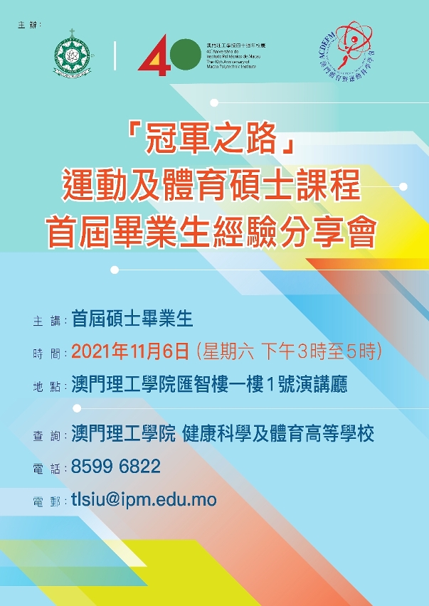 “冠军之路—运动及体育硕士课程首届毕业生经验分享会” 将于11月6日下午三时至五时在澳门理工学院汇智楼一楼1号演讲厅举行,语言为广东话,欢迎有兴趣人士参与。为配合澳门特区政府卫生局的防疫指引,参与活动之人士必须配戴口罩、接受体温探测,并出示当天有效的个人【澳门健康码】。