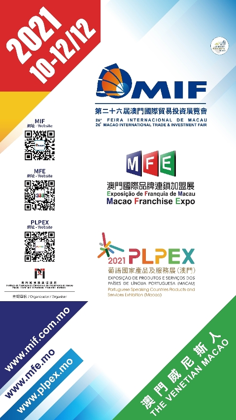 “第二十六届澳门国际贸易投资展览会”(第26届MIF)、“澳门国际品牌连锁加盟展2021”(2021MFE)及“2021年葡语国家产品及服务展(澳门)”(2021PLPEX)将于12月10至12日假澳门威尼斯人继续同期同场举行,今届除了延伸线上线下元素,同时邀请到上海市作为“伙伴市”,助力各地展商及客商合作共赢。