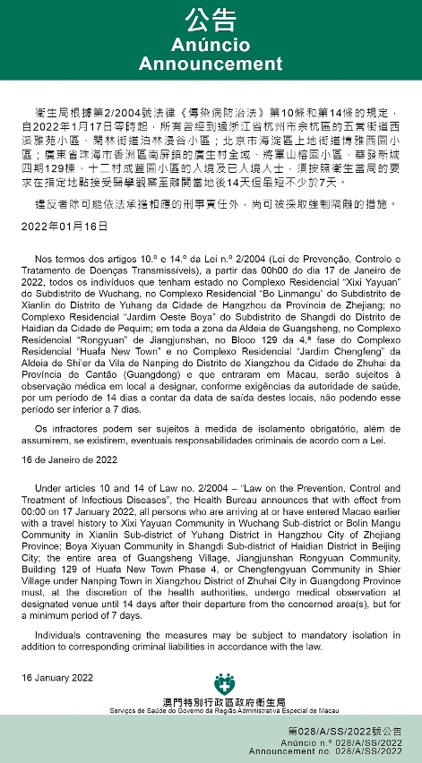 新型冠状病毒感染应变协调中心(下称“应变协调中心”)宣布,因应浙江省、北京市及广东省的疫情变化,卫生局根据第2/2004号法律《传染病防治法》第10条和第14条的规定,自2022年1月17日零时起,所有曾经到过浙江省杭州市余杭区的五常街道西溪雅苑小区、闲林街道泊林漫谷小区;北京市海淀区上地街道博雅西园小区;广东省珠海市香洲区南屏镇的广生村全域、将军山榕园小区、华发新城四期129栋、十二村成丰园小区的入境及已入境人士,须按照卫生当局的要求在指定地点接受医学观察至离开当地后14天但最短不少于7天。