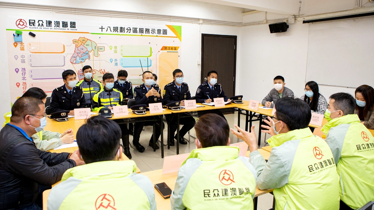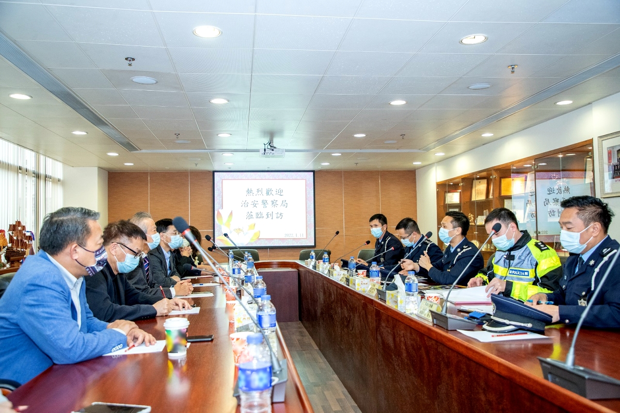 为持续优化「社区警务联络机制」,以及听取社团代表对治安、交通、冬防工作等方面的意见和建议。于本月上旬,治安警察局策划行动厅马超雄代厅长、公共关系处李德辉处长及林强警司、澳门警务厅西南区警务处蒋少鑫代处长及交通厅交通侦查及支援处黄志宏代处长等多名主管,分别拜访澳门社会民生促进会、澳门工会联合总会、澳门街坊会联合总会、澳门归侨总会、民众建澳联盟、澳门物业管理专业人员协会、澳门妇女联合总会、澳门餐饮业联合商会、澳门中华新青年协会及澳门中华学生联合总会。当中澳门社会民生促进会陈溥森会长、澳门工会联合总会冯家辉副会长、澳门街坊会联合总会陈家良理事长、澳门归侨总会赵文炎副会长、民众建澳联盟欧阳广球副理事长、澳门物业管理专业人员协会周嘉进会长、澳门妇女联合总会吴嘉婷副理事长、澳门餐饮业联合商会李汝荣理事长、澳门中华新青年协会刘佐春副会长及澳门中华学生联合总会缪敏立副理事长与多位社团代表出席会议。