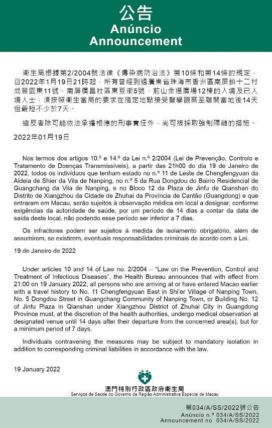 新型冠状病毒感染应变协调中心(下称“应变协调中心”)宣布,因应内地的疫情变化,卫生局根据第2/2004号法律《传染病防治法》第10条和第14条的规定,自2022年1月19日晚上9时起,所有曾经到过广东省珠海市香洲区南屏镇十二村成丰园东11号、南屏广昌社区东豆街5号、前山金福广场12栋的入境及已入境人士,须按照卫生当局的要求在指定地点接受医学观察至离开当地后14天但最短不少于7天。