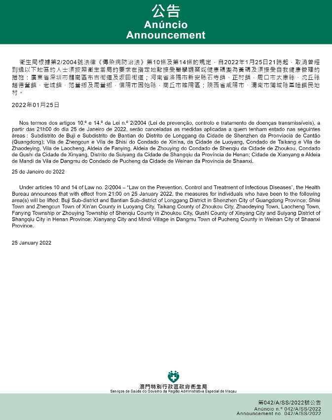 自2022年1月25日晚上9时起,取消曾经到过以下地区的人士须按照卫生当局的要求在指定地点接受医学观察或健康码变为黄码及须接受自我健康管理的措施:广东省深圳市龙岗区布吉街道及坂田街道;河南省洛阳市新安县石寺镇、正村镇,周口市太康县、沈丘县赵德营镇、老城镇、范营乡及周营乡,信阳市固始县,商丘市睢阳区;陕西省咸阳市、渭南市蒲城县党睦镇民地村。