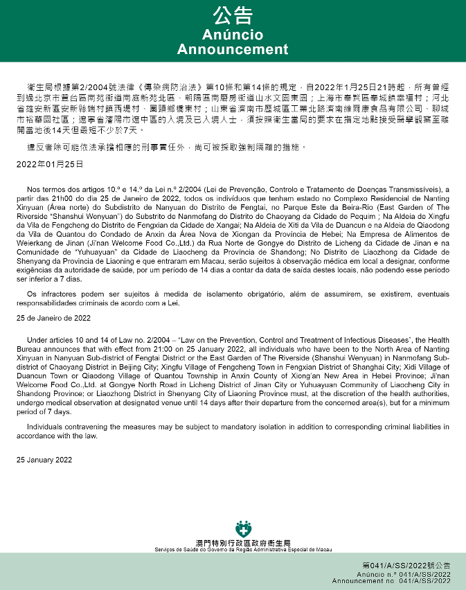 新型冠状病毒感染应变协调中心(下称“应变协调中心”)宣布,因应内地的疫情变化,卫生局根据第2/2004号法律《传染病防治法》第10条和第14条的规定,自2022年1月25日晚上9时起,所有曾经到过北京市丰台区南苑街道南庭新苑北区、朝阳区南磨房街道山水文园东园;上海市奉贤区奉城镇幸福村;河北省雄安新区安新县端村镇西堤村、圈头乡桥东村;山东省济南市历城区工业北路济南维尔康食品有限公司、聊城市裕华园社区;辽宁省沈阳市辽中区的入境及已入境人士,须按照卫生当局的要求在指定地点接受医学观察至离开当地后14天但最短不少于7天。