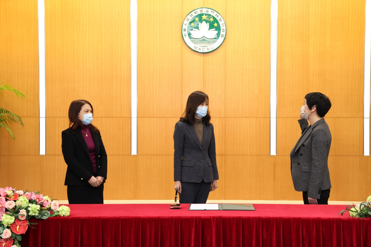 在社会文化司欧阳瑜司长监誓、社会文化司司长办公室何钰珊主任见证下,教育及青年发展局龚志明局长、文化局梁惠敏局长今(4)日在政府总部多功能厅宣誓就职。