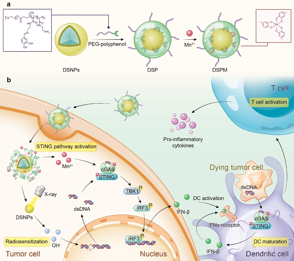 近年来,免疫疗法的兴起改变了癌症治疗的模式,然而肿瘤微环境中淋巴细胞浸润不够,促使肿瘤变“冷”,导致免疫疗法的疗效不高。最新研究结果表示,干扰素基因刺激因子(stimulator of interferon genes,STING)通路的激活能启动抗肿瘤天然免疫应答,使“冷”肿瘤转化为“热”肿瘤,从而提高肿瘤患者对免疫疗法的疗效。传统的放射治疗能诱导胞质dsDNA的形成,进而激活STING通路;此外,单独的锰离子也可作为STING通路的激活因子,因此,团队利用化学合成的多酚衍生物与多种金属离子配位,构建新型金属—多酚网络DSPM,以激活肿瘤微环境STING通路,助力肿瘤放射治疗。