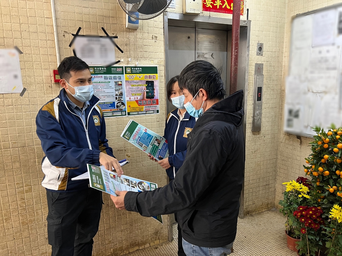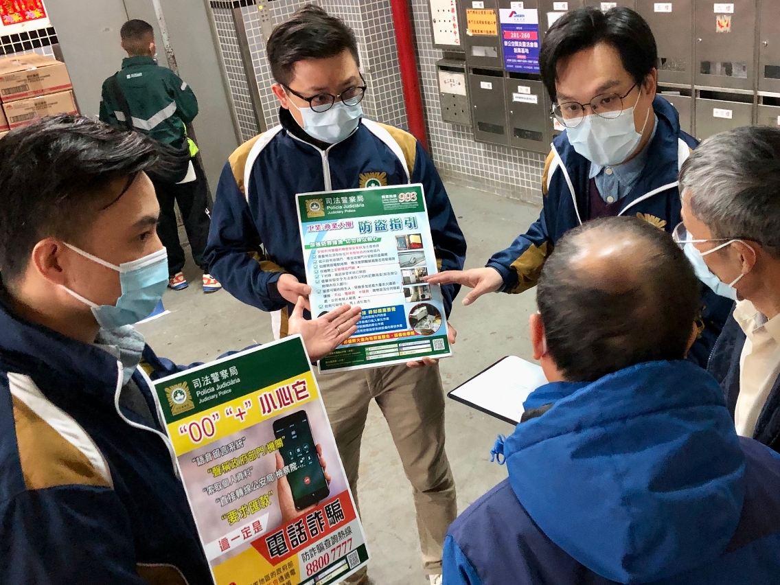 在警察总局统筹下,司法警察局于农历新年期间展开第二阶段冬防行动,派出刑侦人员于本澳各区进行防罪巡逻,亦巡查工商业大厦,提醒物业管理人员及商户做好防罪措施,警民合作,共同防范罪案发生。