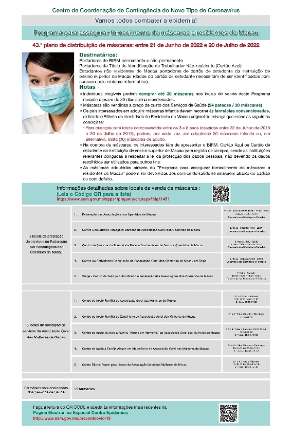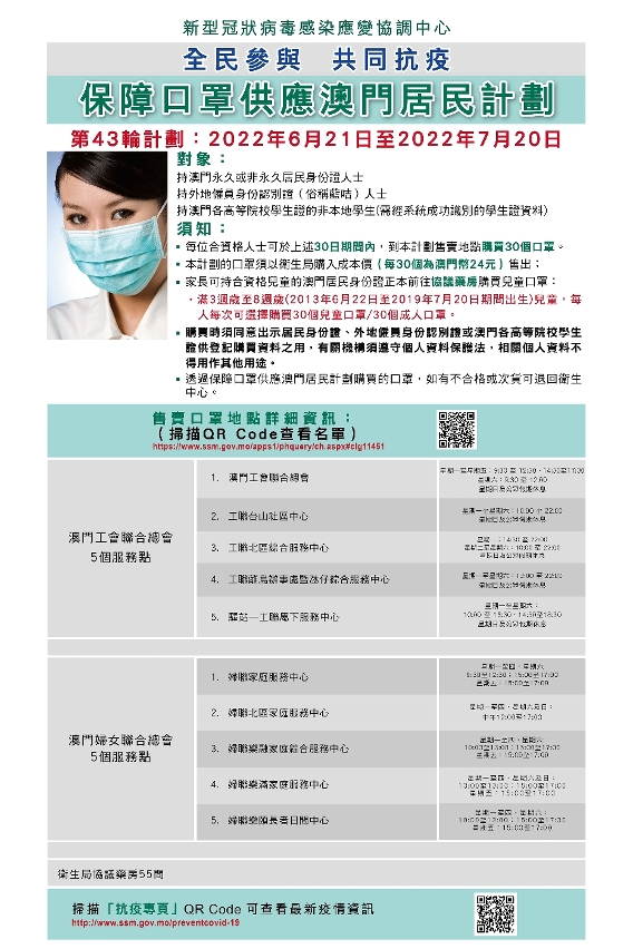新型冠状病毒感染应变协调中心今(20)日公布,第43轮保障口罩供应澳门居民计划(下称“口罩计划”)于明(21)日开始,售卖期间为30日,即2022年6月21日至2022年7月20日,期间每人可一次性购买30个口罩,售价合共24澳门元。卫生局协议药房、本澳2个社团(工联、妇联)继续提供售卖口罩服务。即全澳共有65个售卖点,服务时间详见附图。透过口罩计划购买的口罩,如有不合格或次货可退回卫生中心。