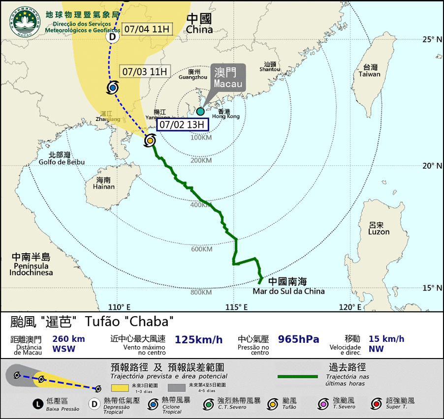台风「暹芭」集结在本澳西南偏西约260公里,正缓慢向西北方向移动,预料下午至傍晚于湛江至茂名一带登陆。由于「暹芭」路径较预期偏北,且移速较慢,对澳门的影响会在下午持续,因此八号风球将于下午维持。受「暹芭」雨带影响,本澳今日间中有大骤雨及雷暴,吹7至8级东至东南风及有阵风。
