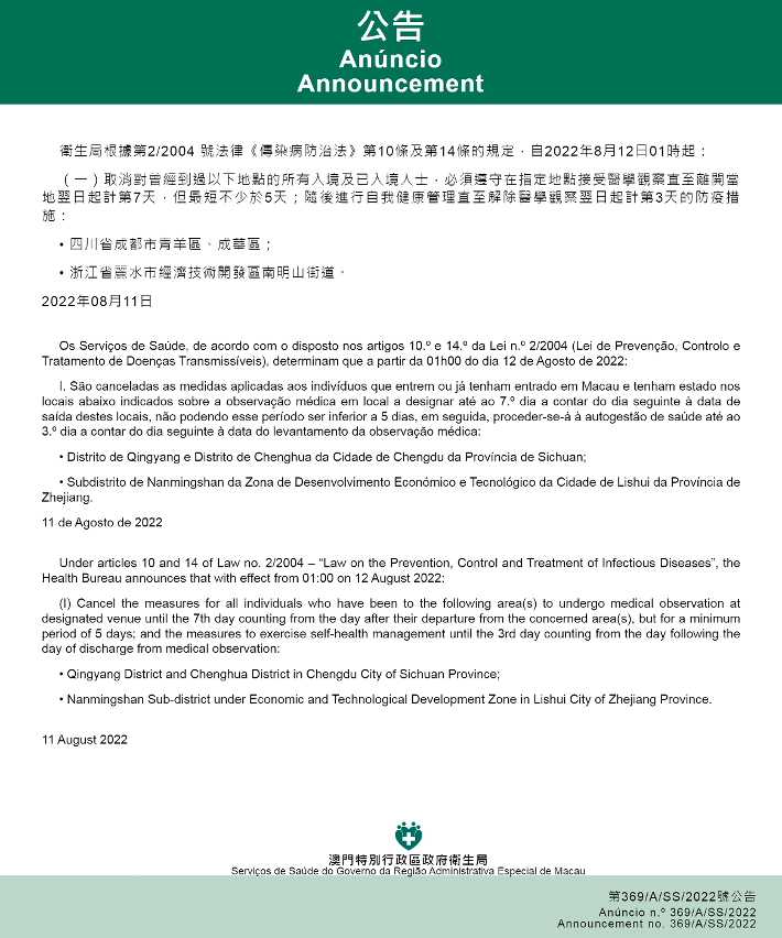 新型冠状病毒感染应变协调中心(下称应变协调中心)宣布,因应内地的疫情变化,卫生局根据第2/2004号法律《传染病防治法》第10条和第14条的规定,自2022年8月12日凌晨1时起,新增或取消对曾到内地相关区域人士的防疫措施: