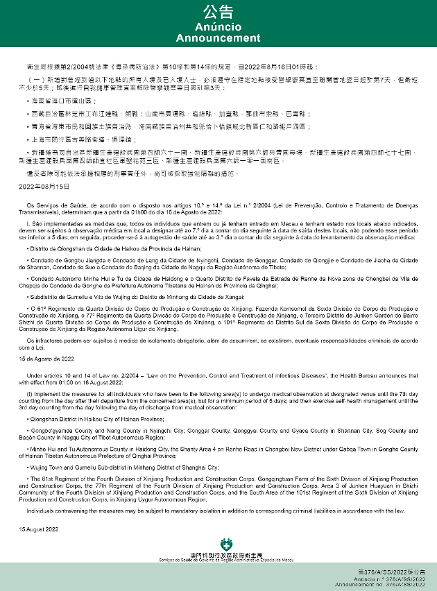新型冠状病毒感染应变协调中心(下称应变协调中心)宣布,因应内地的疫情变化,卫生局根据第2/2004号法律《传染病防治法》第10条和第14条的规定,自2022年8月16日凌晨1时起,新增或取消对曾到内地相关区域人士的防疫措施:
