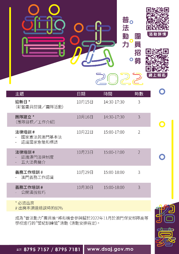 为让更多青年学生学习《宪法》、《基本法》以及本澳各种法律知识,并一同参与普法工作,法务局由即日起至10月6日,将招募青少年义工团队“普法动力”新团员,在本澳就读中三至大专院校的学生,均可报名参加。