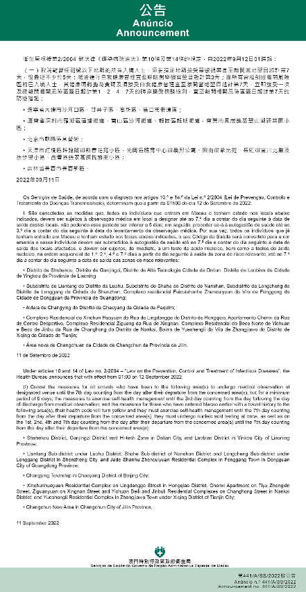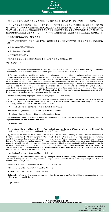 新型冠状病毒感染应变协调中心(下称应变协调中心)宣布,因应内地的疫情变化,卫生局根据第2/2004号法律《传染病防治法》第10条和第14条的规定,自2022年9月12日凌晨1时起,新增或取消对曾到内地相关区域人士的防疫措施: