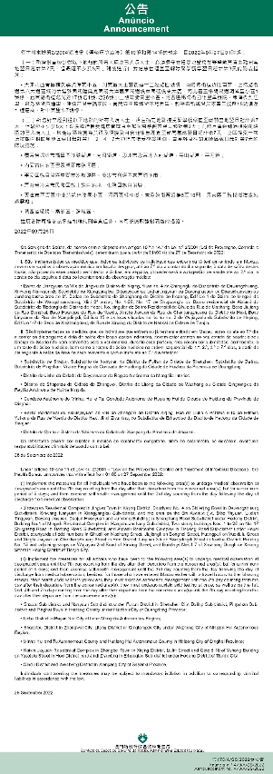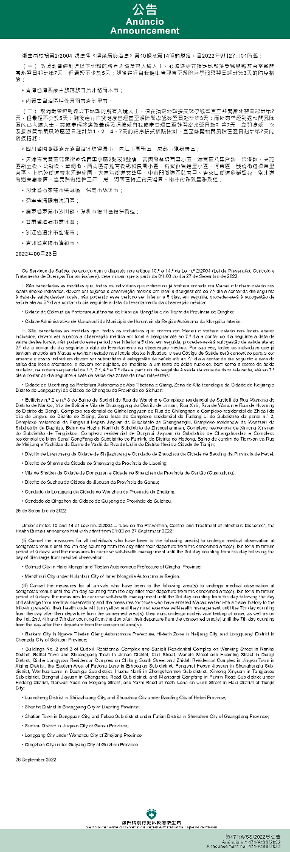 新型冠状病毒感染应变协调中心(下称应变协调中心)宣布,因应内地的疫情变化,卫生局根据第2/2004号法律《传染病防治法》第10条和第14条的规定,自2022年9月27日凌晨1时起,新增或取消对曾到内地相关区域人士的防疫措施: