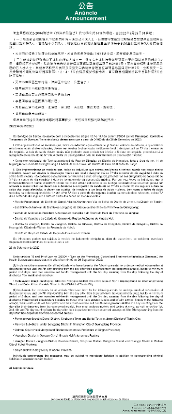 新型冠状病毒感染应变协调中心(下称应变协调中心)宣布,因应内地的疫情变化,卫生局根据第2/2004号法律《传染病防治法》第10条和第14条的规定,自2022年9月29日凌晨1时起,新增或取消对曾到内地相关区域人士的防疫措施: