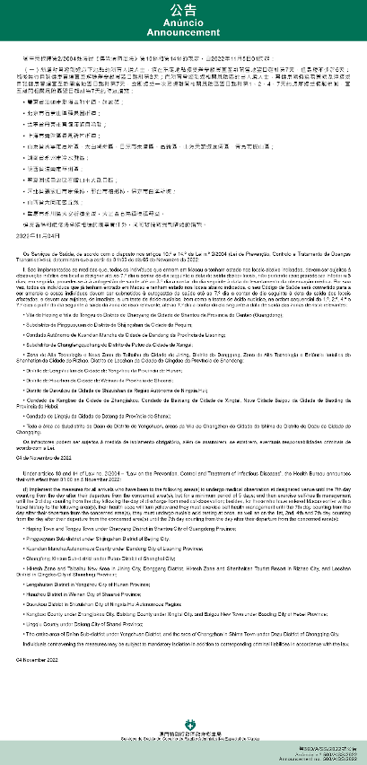 新型冠状病毒感染应变协调中心(下称应变协调中心)宣布,因应内地的疫情变化,卫生局根据第2/2004号法律《传染病防治法》第10条和第14条的规定,自2022年11月5日凌晨1时起,新增或取消对曾到内地相关区域人士的防疫措施: