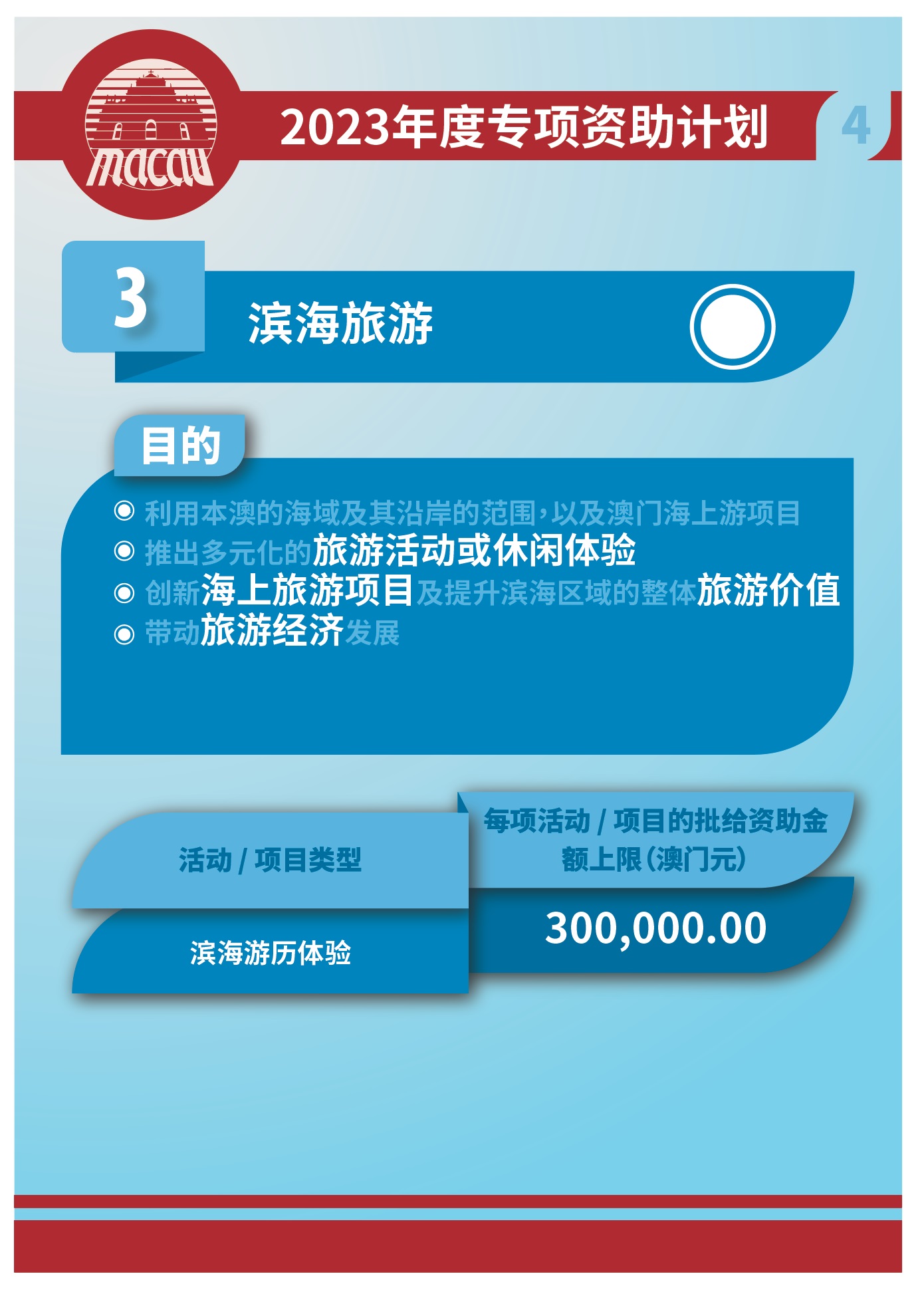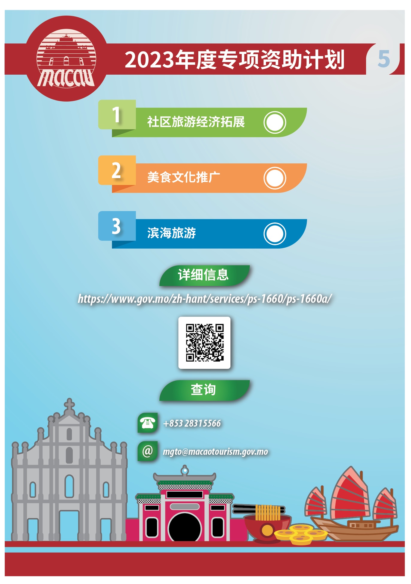 2023年度的“社区旅游经济拓展”、“美食文化推广”和“滨海旅游”专项资助计划于11月11日起接受申请,有意者请以澳门公共服务一户通实体使用者帐户提出申请。