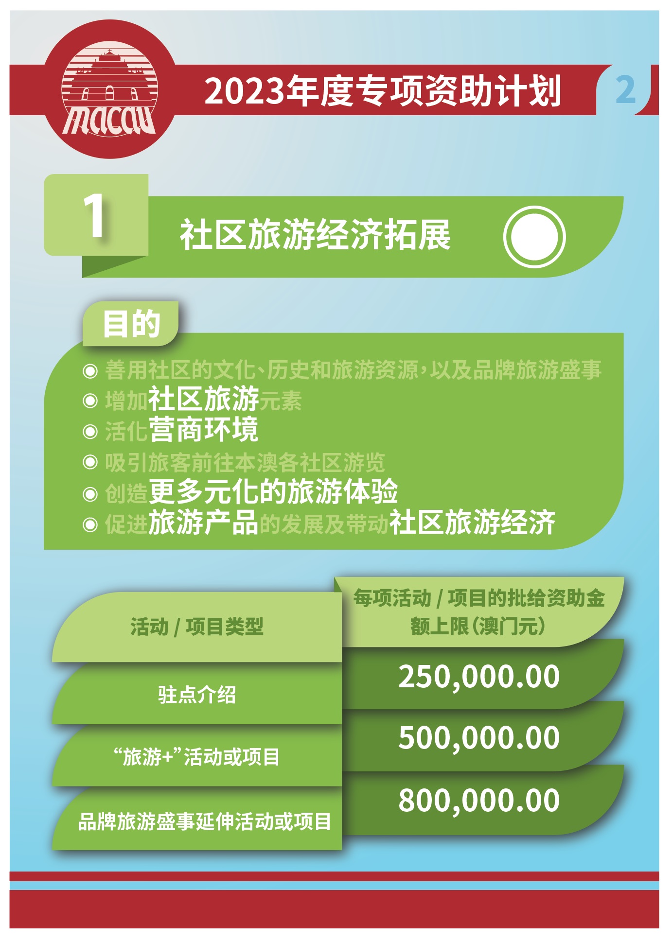 旅游局推出专项资助计划,目的为积极鼓励及支援澳门依法成立的非牟利社团举办及开展多元化旅游活动或项目,带动社区经济,促进社区旅游发展。