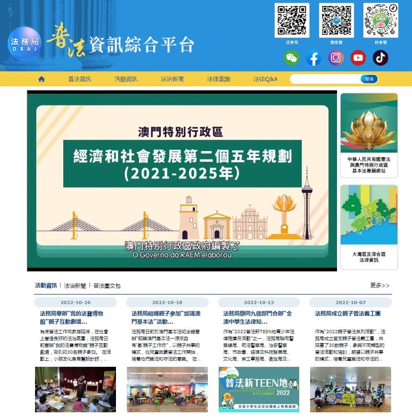 欢迎市民登入法务局“普法资讯综合平台”(网址:https://www.dsaj.gov.mo/DsajInfo/index.aspx)或扫瞄专属的二维码,浏览和查找普法资讯。