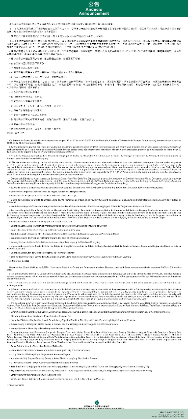 新型冠状病毒感染应变协调中心(下称应变协调中心)宣布,因应内地的疫情变化,卫生局根据第2/2004号法律《传染病防治法》第10条和第14条的规定,自2022年11月12日凌晨1时起,新增或取消对曾到内地相关区域人士的防疫措施: