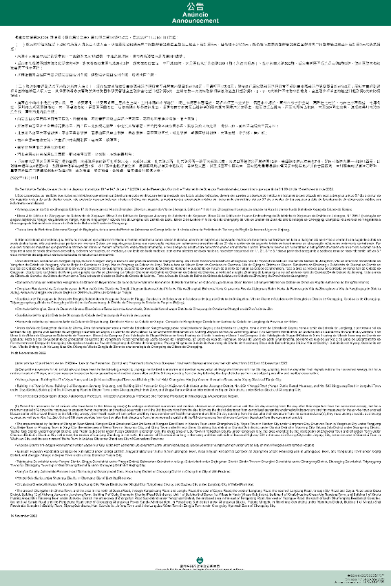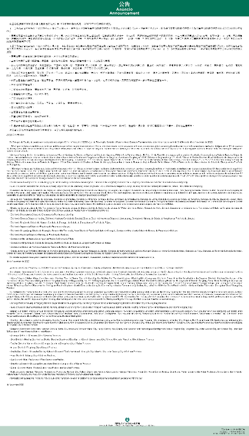 新型冠状病毒感染应变协调中心(下称应变协调中心)宣布,因应内地的疫情变化,卫生局根据第2/2004号法律《传染病防治法》第10条和第14条的规定,自2022年11月15日凌晨1时起,新增或取消对曾到内地相关区域人士的防疫措施: