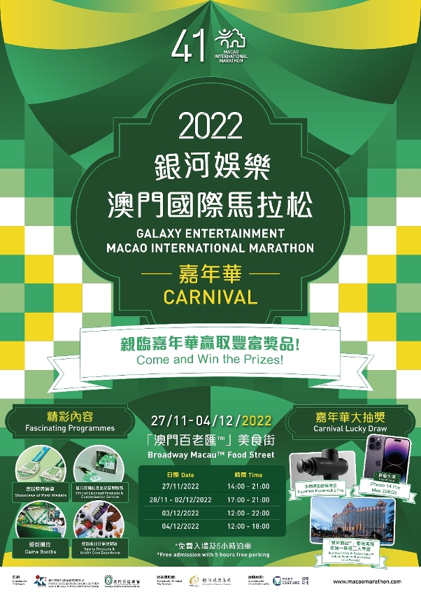 为增加赛事气氛,由11月27日至12月4日一连八天,将在「澳门百老汇TM」美食街举办「2022银河娱乐澳门国际马拉松嘉年华」,活动内容丰富,包括:历届奖牌展示、有奖游戏摊位及大抽奖,亦有不同类型的体育用品展出,包括运动服饰、补充品及医疗保健品等,并设有购物优惠,藉举办有关活动营造浓厚的赛事氛围,而马拉松嘉年华的开幕仪式将于11月27日下午4时于百老汇舞台1楼举行,欢迎市民及旅客到场参与。