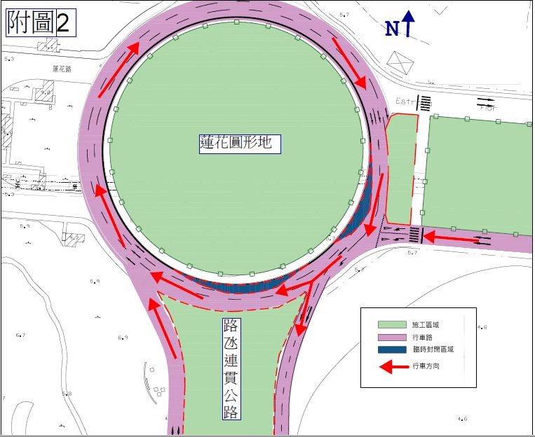 2022年12月1日开始至2022年12月21日期间,每日晚上8时至翌日早上6时,届时将局部封闭莲花圆形地东侧的行车线部分路段,只保留1条行车线予车辆通行(请参阅附图一)。而在每天早上6时至晚上8时,将临时重新开放原有的2条行车线予车辆通行(请参阅附图二)。请驾驶者留意现场交通指示标志或遵守现场交通警员的指挥及安排。