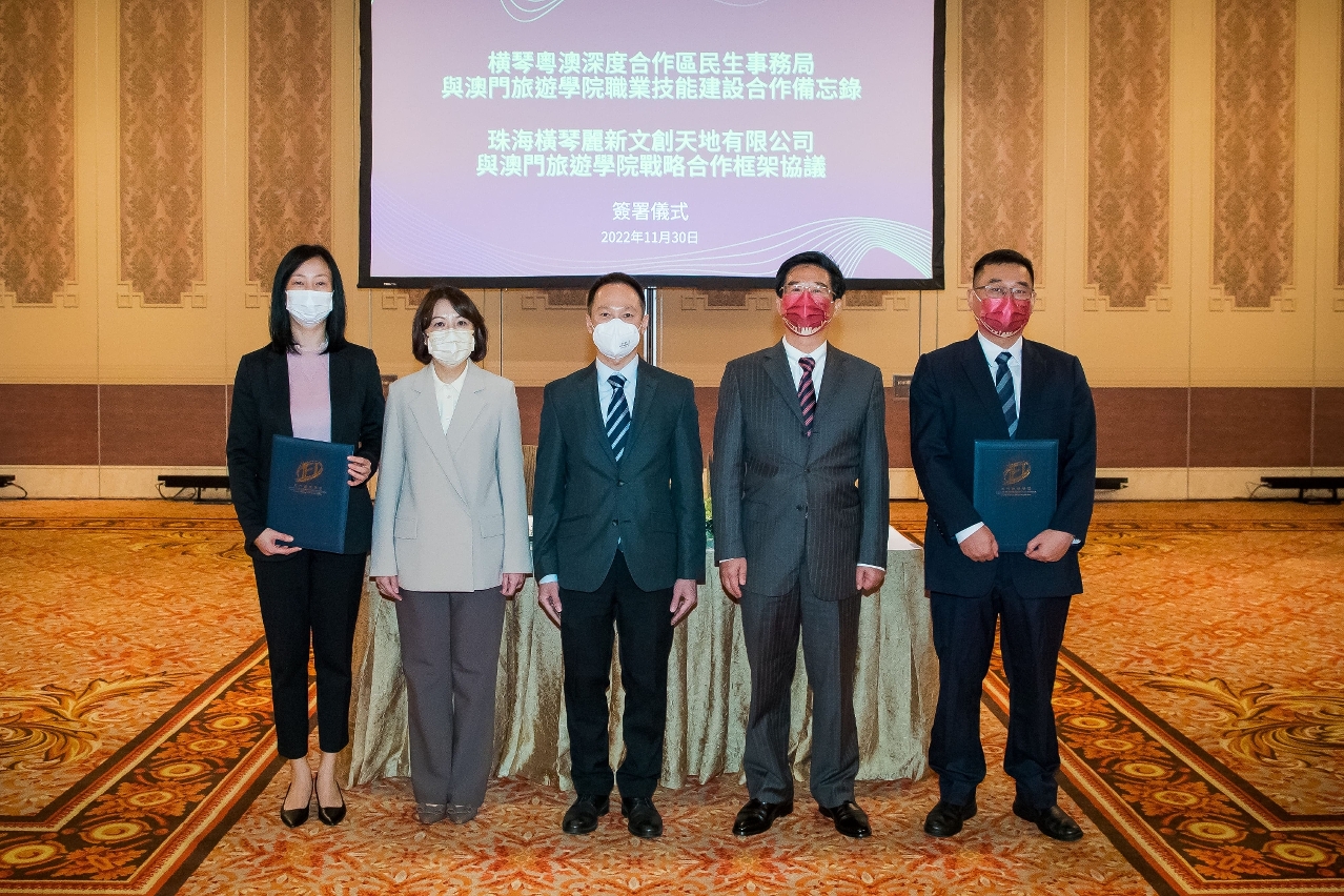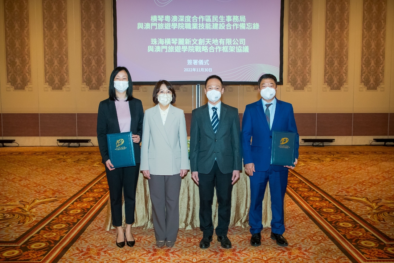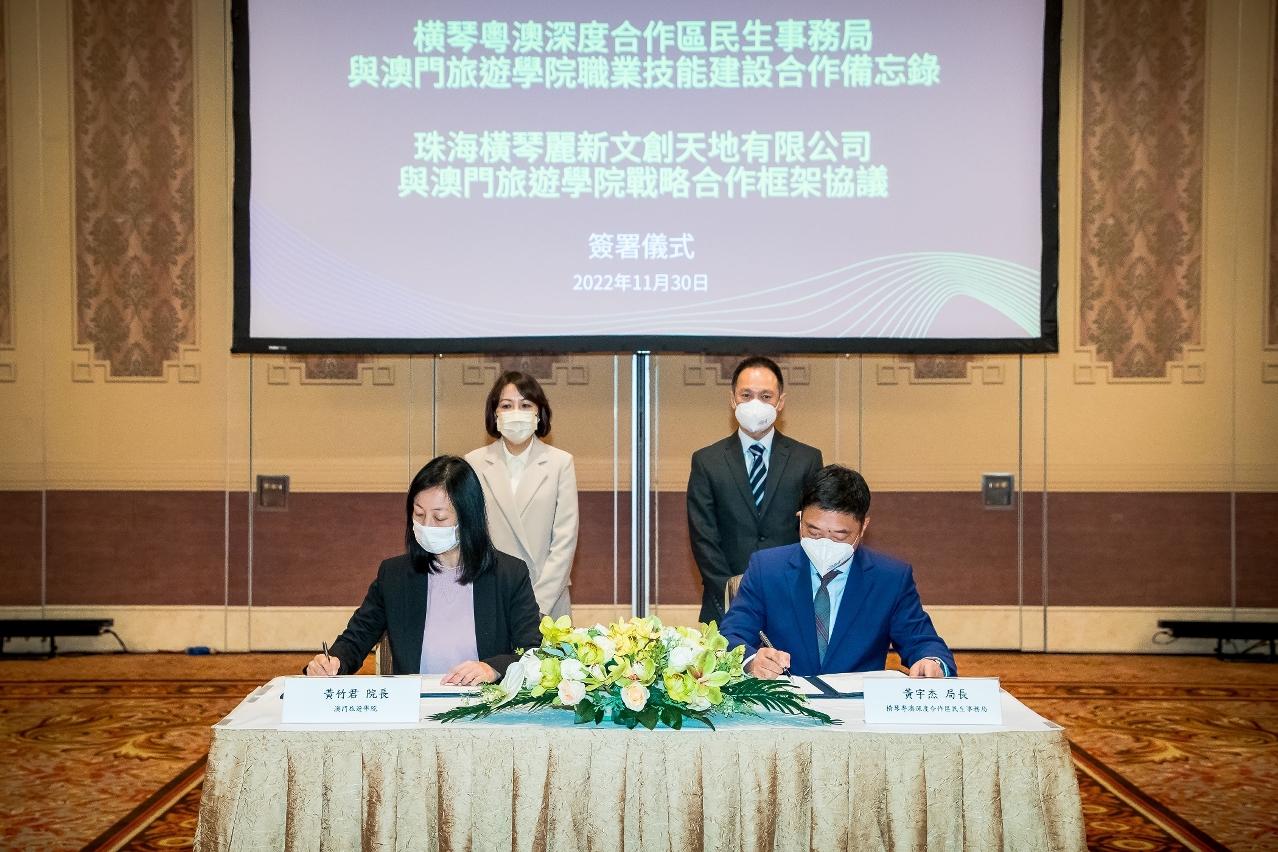 为深入贯彻落实《横琴粤澳深度合作区建设总体方案》,以及《粤港澳大湾区发展规划纲要》,进一步整合琴澳资源及发挥协同效应,共谋合作发展契机,澳门旅游学院黄竹君院长分别与横琴粤澳深度合作区民生事务局黄宇杰局长,以及珠海横琴丽新文创天地有限公司孔茂副总裁于11月30日假澳门伦敦人酒店签署备忘录和战略合作框架协议。澳门社会文化司司长代表梁咏娴顾问、横琴粤澳深度合作区执行委员会吴子健副主任及珠海横琴丽新集团相关领导现场出席并见证。