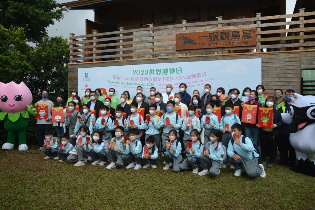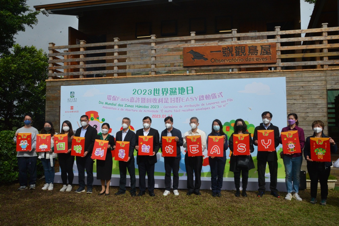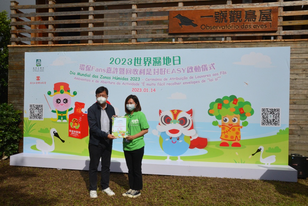 环境保护局为响应2月2日的世界湿地日,于2023年1月14日在路氹城生态保护区举行2023世界湿地日—环保Fans嘉许暨回收利是封好EASY启动仪式。由环境保护局谭伟文局长及“环保Fun”之环保行为攞满Fun活动的协办单位澳门工会联合总会副会长张国然,向协助路氹城生态保护区导赏表现出色的环保Fans进行嘉许。