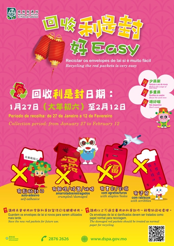 同时,为推动“源头减废”,环境保护局持续于新春期间举办回收利是封好EASY活动,宣传「少用新、多重用、唔好嘥」的环保讯息。市民可于环境保护局、环保加Fun站、澳门街坊会联合总会、澳门工会联合总会、澳门妇女联合总会、民众建澳联盟、澳门明爱、澳门中华新青年协会、澳门扶康会以及澳门社会民生促进会,共58个派发点索取重用利是封。同时,于2023年1月27日(大年初六)至2月12日期间,环境保护局将继续与政府部门、社团、酒店、银行、学校、商户以及大厦等合作,设置利是封回收点,有关详情敬请浏览本局网页 http://www.dspa.gov.mo/redpacketrecycling.aspx。