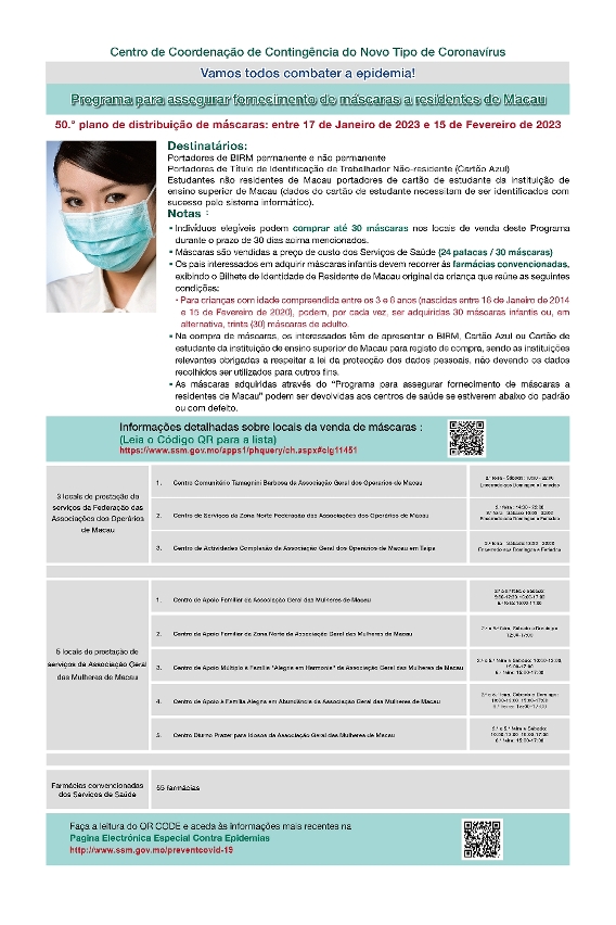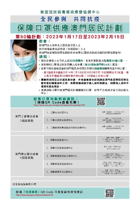 新型冠状病毒感染应变协调中心今(16)日公布,第50轮保障口罩供应澳门居民计划(下称“口罩计划”)于明(17)日开始,配售期间为30日,即2023年1月17日至2023年2月15日,期间每人可一次性购买30个口罩,售价合共24澳门元。卫生局协议药房、本澳2个社团(工联、妇联)继续提供配售口罩服务,即全澳共有63个配售点,服务时间详见附图。透过口罩计划购买的口罩,如有不合格或次货可退回卫生中心。