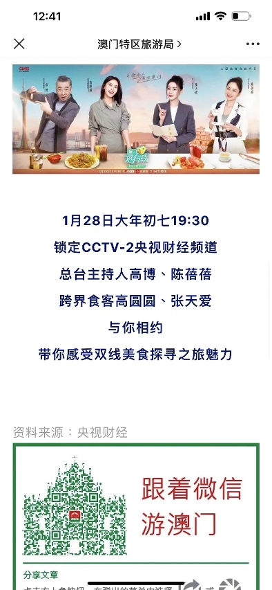 由特区政府与中央广播电视总台联合打造的大型美食文旅真人秀节目——《澳门双行线——美食文旅来打卡》定于本周六(1月28日)年初七晚上7点30分在CCTV-2央视财经频道首播,“央视频”及“央视财经”手机应用同步播出,带领内地广大观众感受澳门双线美食之旅,助力提升澳门旅游吸引力。