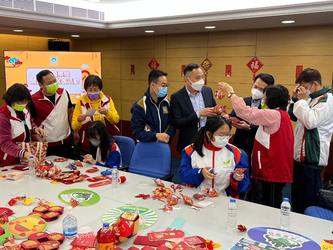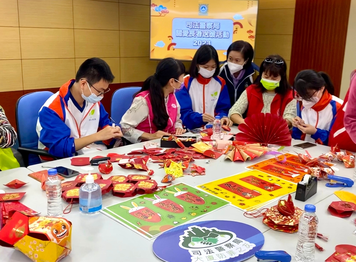 探访活动前,司警局人员联同二十多位大厦防罪之友和妇女防罪之友会员、社区安全青年领袖及灭罪小先锋学员于司警局总部大楼进行事前准备,齐心协力利用回收的利是封制作成别具节日特色的迎春挂饰,以及包装新春福包。