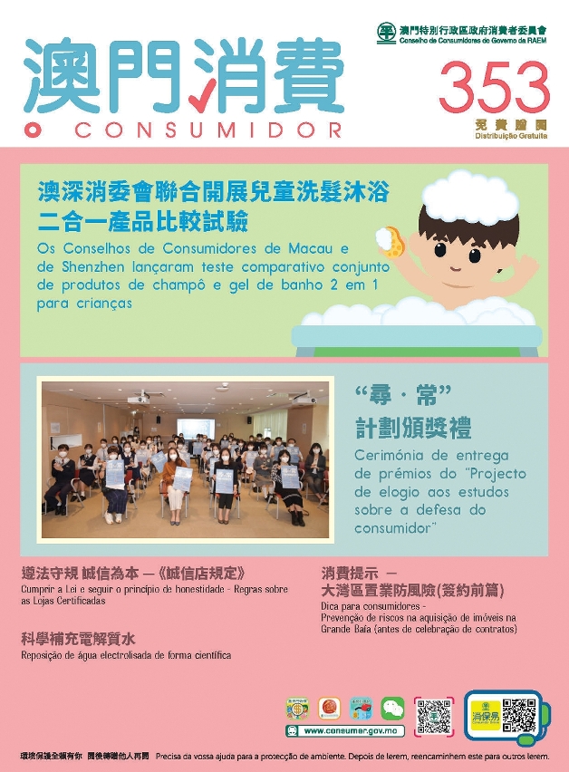 第353期《澳门消费》其他内容有认识及选用电解质水饮品等资讯,消费者可登入消委会网页(www.consumer.gov.mo)及微信(WeChat)帐号浏览新一期《澳门消费》,亦可亲临高士德大马路26号何鸿燊夫人大厦消委会办事处、文化局属下各公共图书馆、八角亭图书馆及澳门文化广场等地点免费索取《澳门消费》。