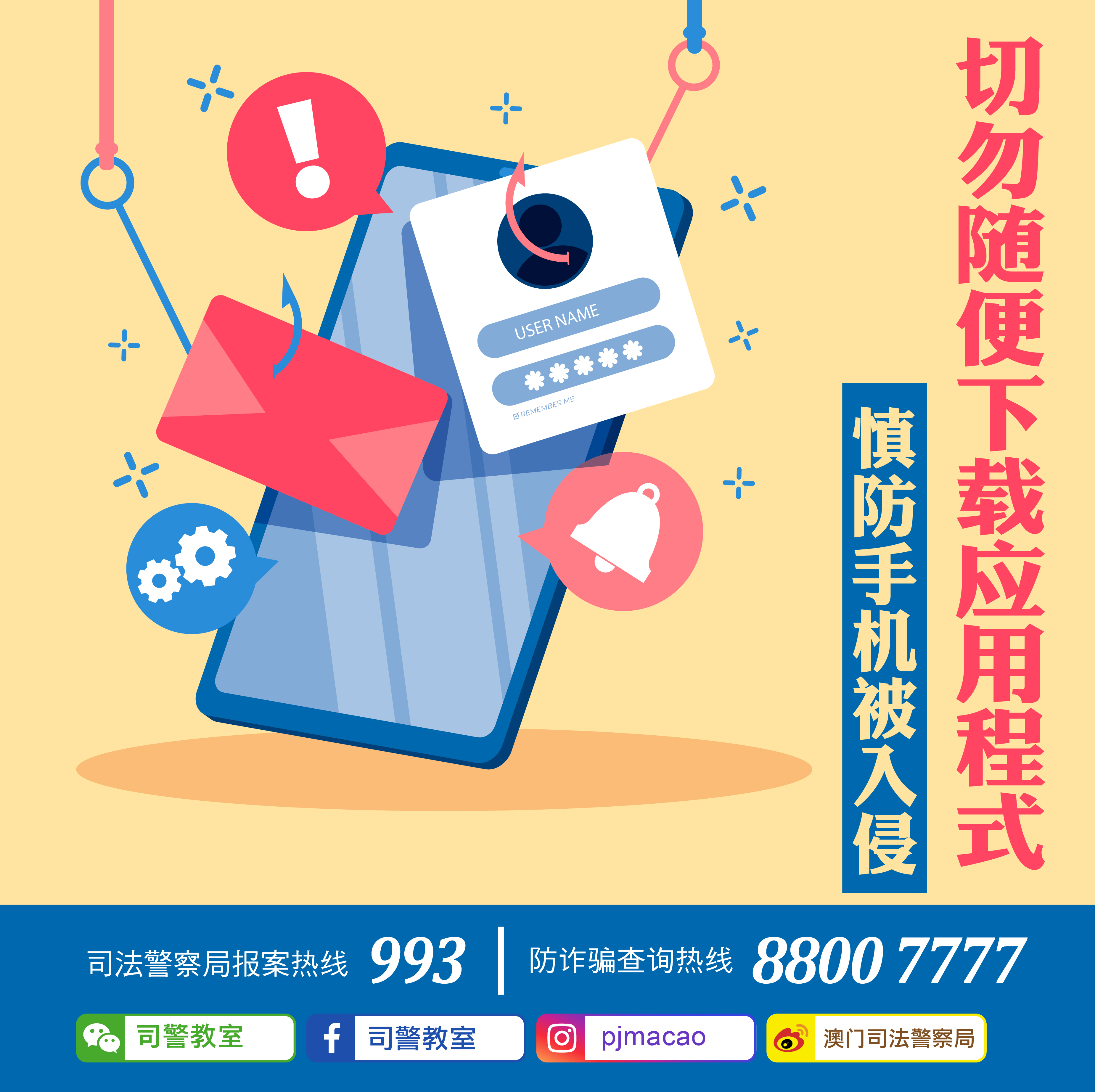 近日司法警察局接获多名市民报案,指在某社交网站看到招聘广告,遂透过手机通讯软件联络招聘方,并应对方要求于手机下载安装“入职系统”应用程式,以及填写个人资料。随后,事主收到由某电子支付平台发送有关重设登入密码的短信,接着便收到多条交易通知短信,怀疑其帐户被盗用,马上报警求助。