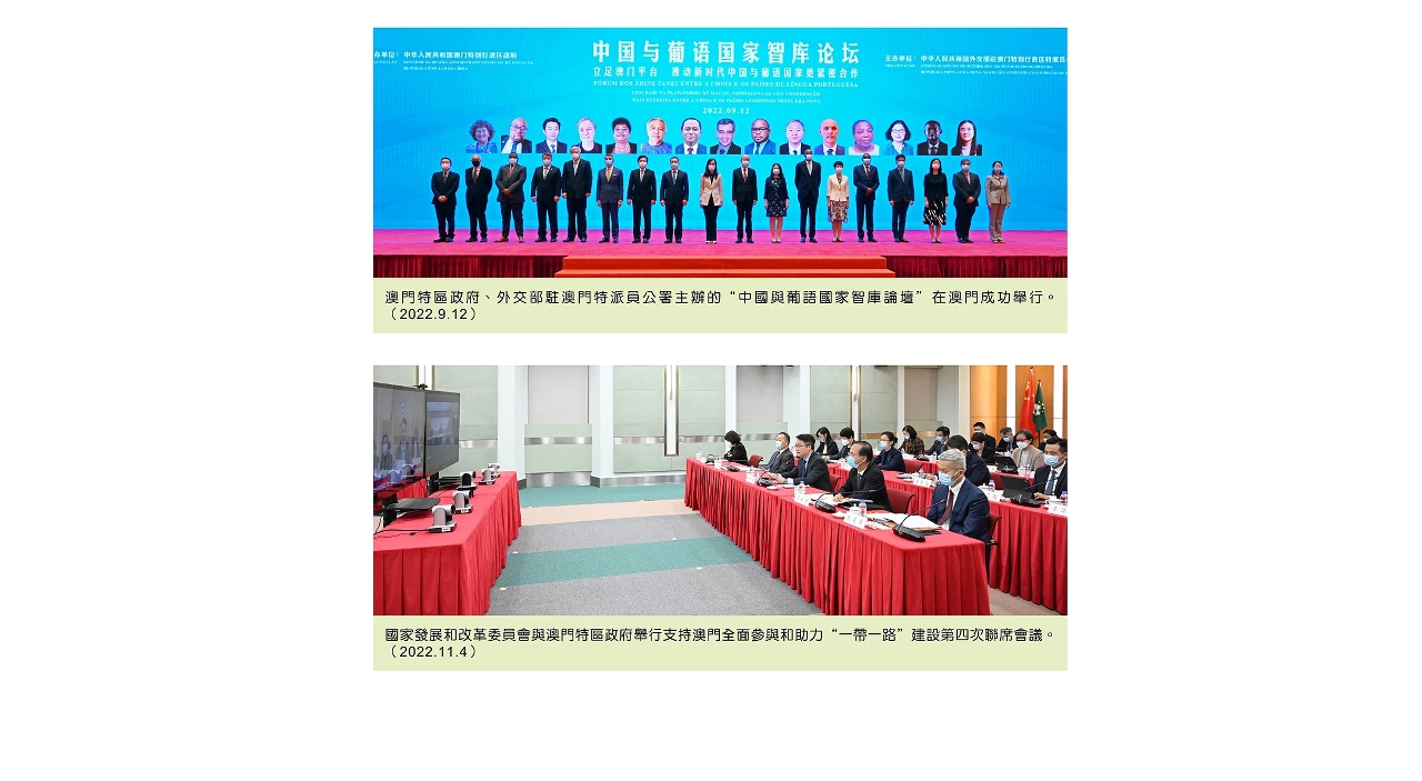 澳门特区积极参与国家“一带一路”倡议,持续与“一带一路”沿线国家和葡语系国家加强联系,并与内地各省市及香港特区拓展更广泛交流与合作,携手共谋发展。