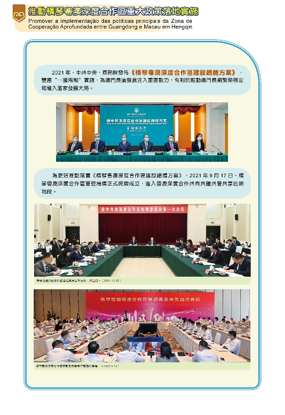 横琴粤澳深度合作区开局一年多以来,出台了多项政策措施,各项工作取得阶段性成果。今年2月,广东省人大常委会发布《横琴粤澳深度合作区发展促进条例》,推动实现琴澳一体化发展,为澳门经济适度多元,以及澳门居民生活、就业,提供了新的空间。同月23日,《关于金融支援横琴粤港澳深度合作区建设的意见》出台,助力内地与澳门的金融合作,为横琴建设粤港澳大湾区重大合作平台提供坚实的金融支撑。