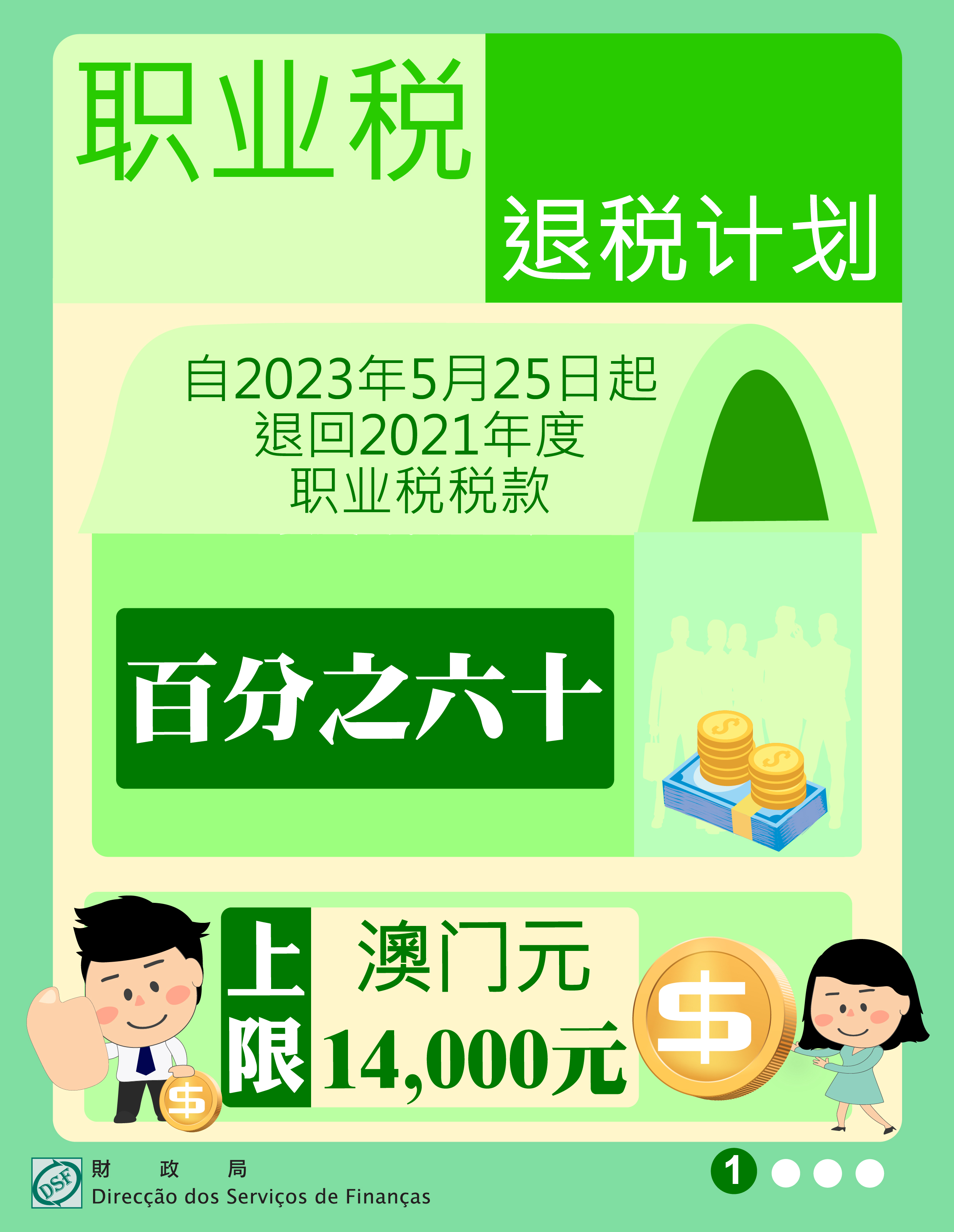 财政局将于5月25日起向符合资格的澳门居民退还2021年度已缴纳的职业税税款百分之六十,上限为澳门元14,000元。